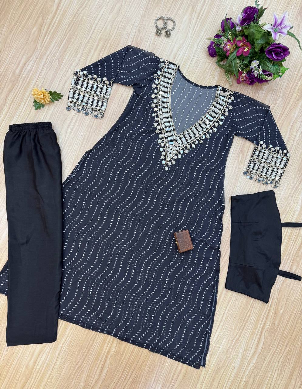 Make a dazzling statement with this exquisite Georgette Kurti Set, meticulously designed to blend traditional charm with modern elegance. The kurti features a digital print base enhanced with detailed embroidery and real mirror cut-work borders, making it a perfect choice for festive functions, family gatherings, or elegant day events.