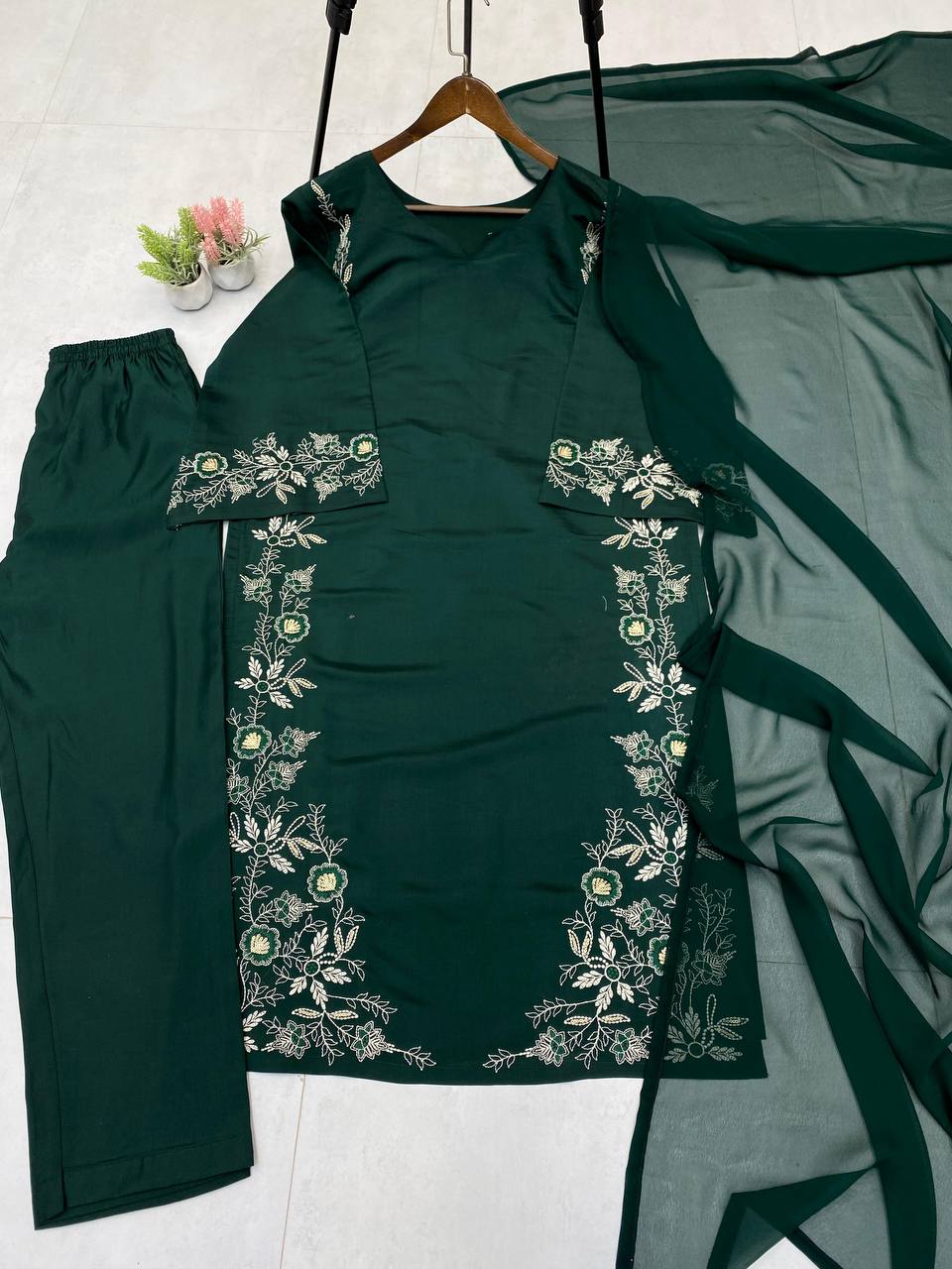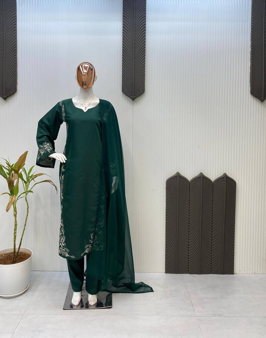 Unveil timeless charm with this sophisticated Roman Silk Embroidered Suit Set, designed to bring effortless elegance to any occasion. The top is crafted from premium Roman silk fabric, known for its smooth texture and rich appearance. Adorned with sequin embroidery work on the front, this outfit adds a gentle sparkle that elevates your festive or semi-formal look. With a height of 46 inches, the top falls gracefully, and the soft micro inner ensures breathable comfort throughout the day. It is available in fully stitched sizes from M to XXL.