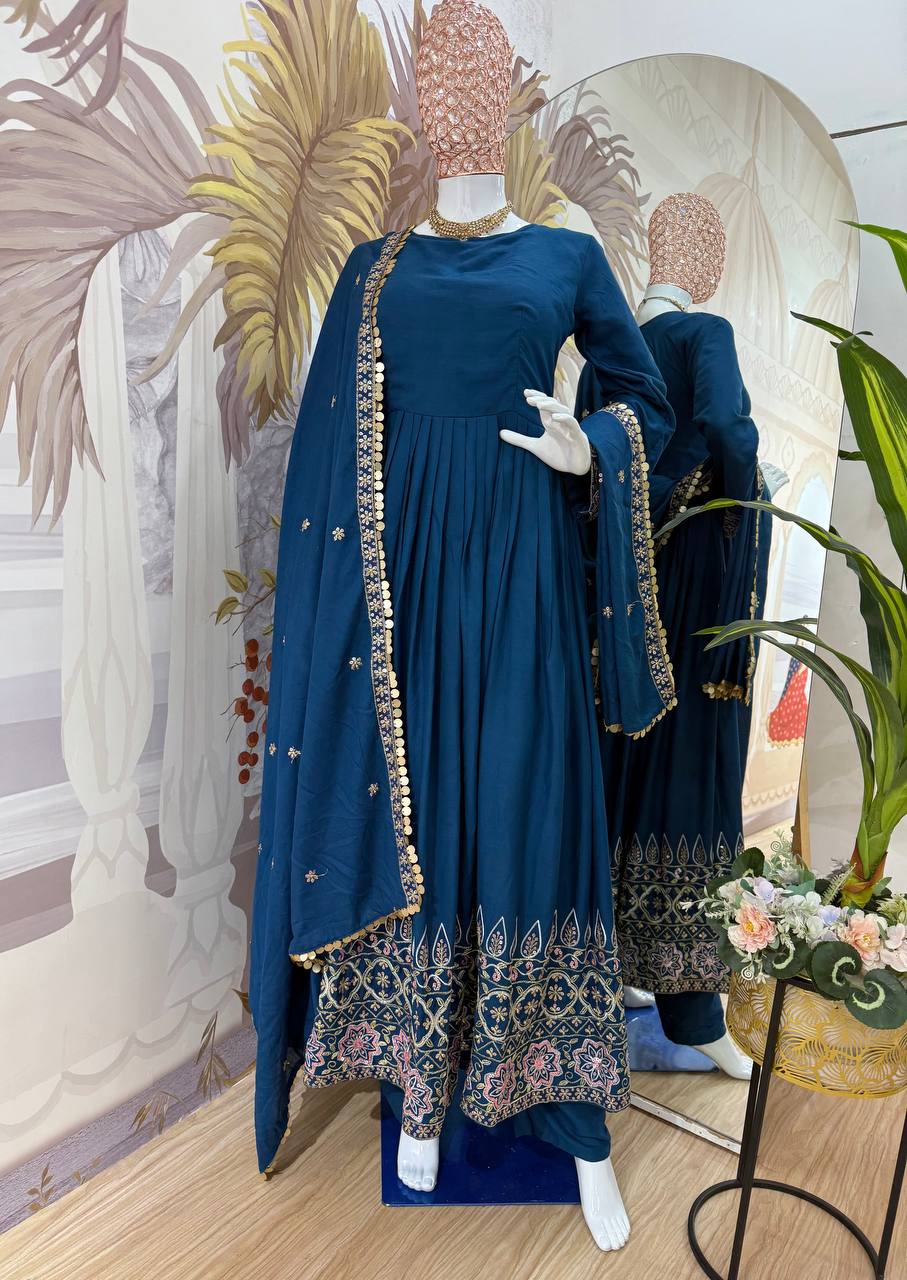 Elegant 3-piece gown set in 12 kg Rayon with embroidery on daman, paired with a matching embroidered dupatta and comfortable Malay crepe pant with elastic waist. Perfect for festive and ethnic occasions.