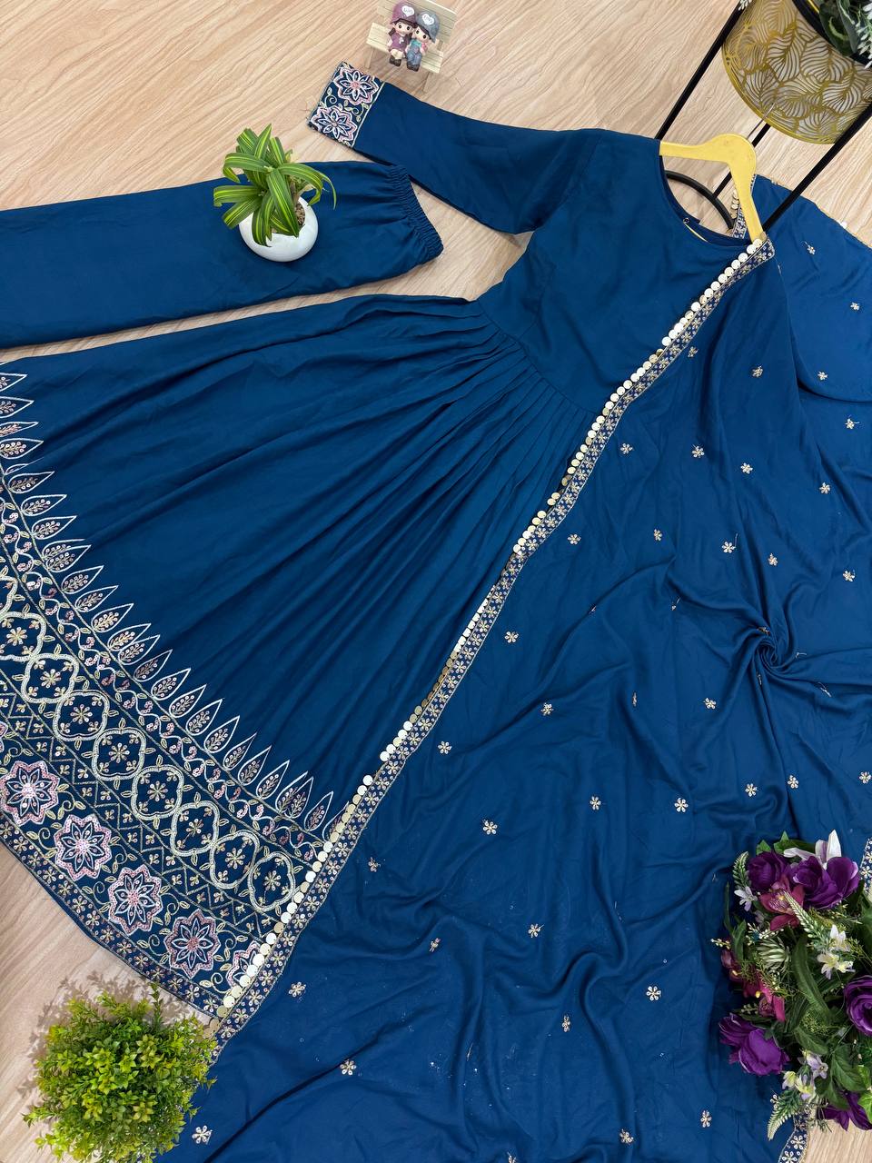 Step into effortless elegance with this beautifully curated 3-piece set, blending comfort, charm, and tradition in one ensemble. The star of this outfit is the gown, crafted from premium 12 kg Rayon that offers a soft fall and luxurious feel. Adorned with intricate embroidery work on the daman patta, the gown flows gracefully with a generous 3.5-meter flair, creating a stunning silhouette for any festive or formal occasion.